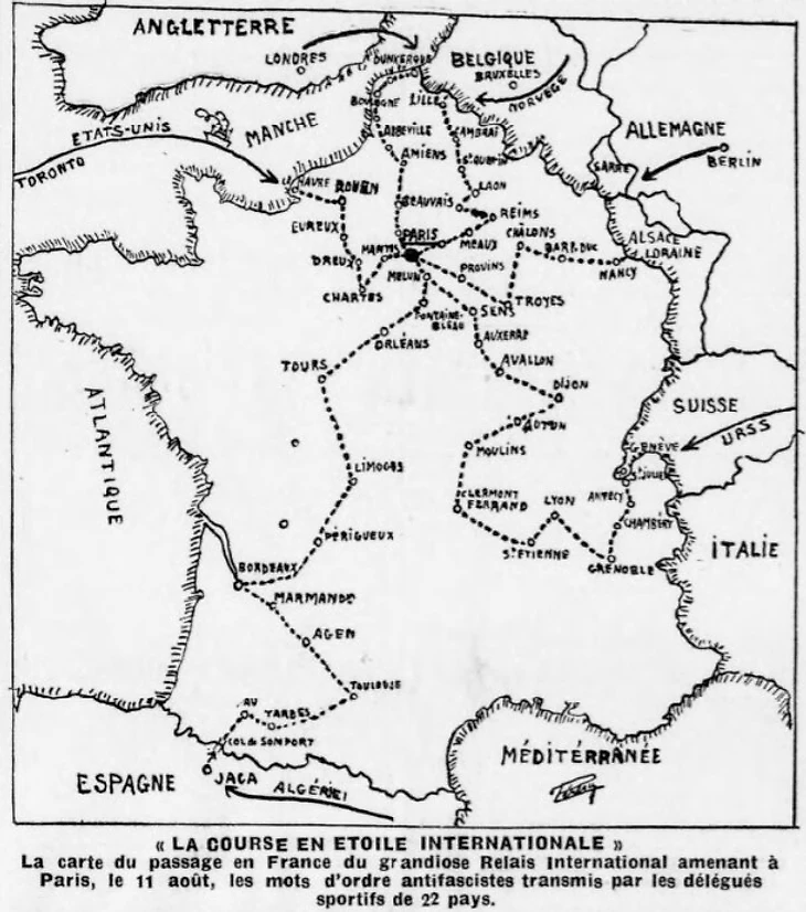 «Путь международных звезд». Карта движения по Франции участников грандиозного международного антифашистского движения из двадцати двух стран, которые соберутся в Париже 11 августа» (еженедельник «Спорт» № 40 от 4 июля 1934 года)