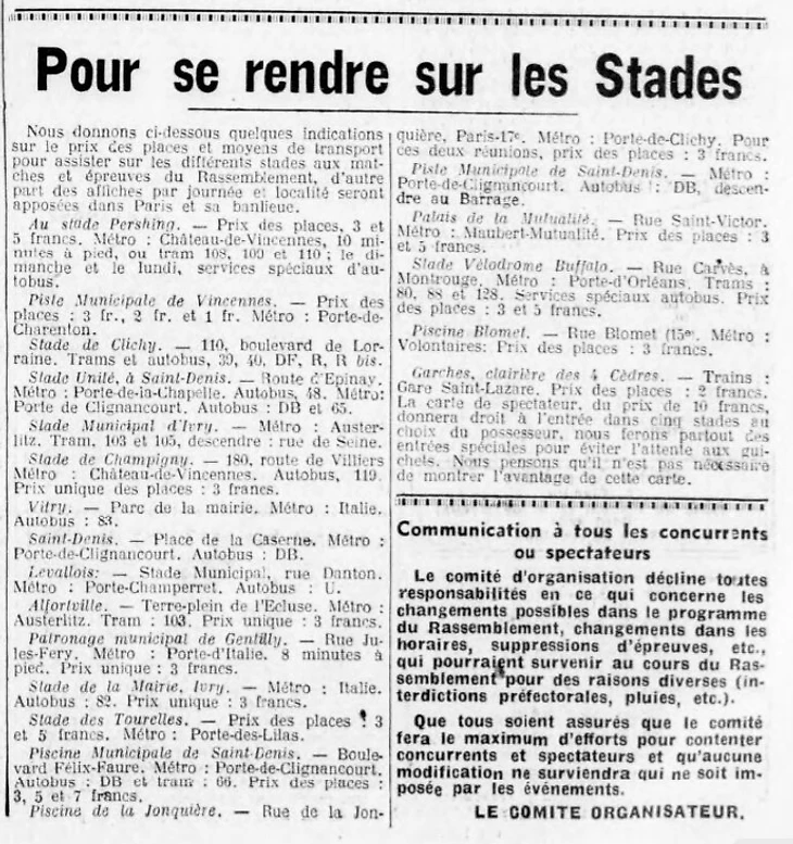 Август 1934 года. Большой Париж. Международный спортивный антифашистский слет. Информация из еженедельника «Спорт» № 45 от 8 августа1934 года о стадионах Слета и как до них добраться