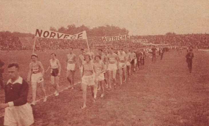12 августа 1934 года. Париж. Стадион «Персен» / Stade Pershing. Международный спортивный антифашистский слет. Парад участников. Норвежская и австрийские делегации (газета «Арбайдерблатет» (Осло) от 17 августа 1934 года)