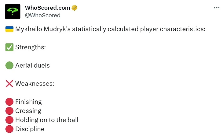 Кто-то в реплаях попросил характеристику полузащитника «Челси» Михаила Мудрика, и ответ WhoScored было настолько честным, что получился даже слишком жестоким.