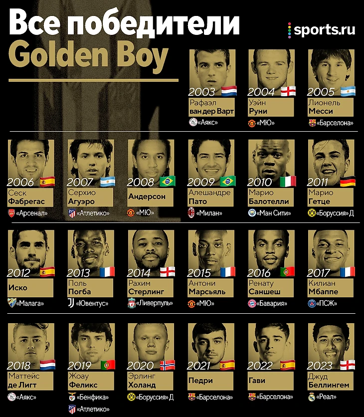 ● Беллингем стал лишь третьим англичанином с Golden Boy. Почти уложился в тенденцию: в 2004-м победил Уэйн Руни, в 2014-м – Рахим Стерлинг. Джуд получил приз в 2023-м – решил не ждать красивых цифр.