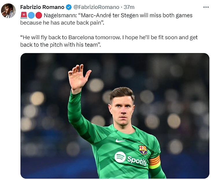 «Марк-Андре тер Стеген пропустит оба матча из-за острой боли в спине. Завтра он вылетит обратно в Барселону. Я надеюсь, что он скоро поправится и вернется на поле со своей командой».