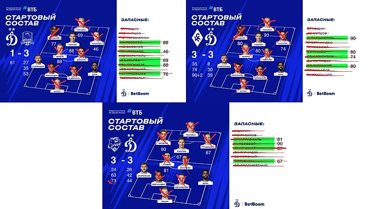 При попытке найти корень проблем составили таблицу всех игроков этих злополучных матчей, которые не позволили Динамо Москва набрать 9 очков. Из этой таблицы видно, что «главными виновниками» динамовских проблем являются ... смотрите видео