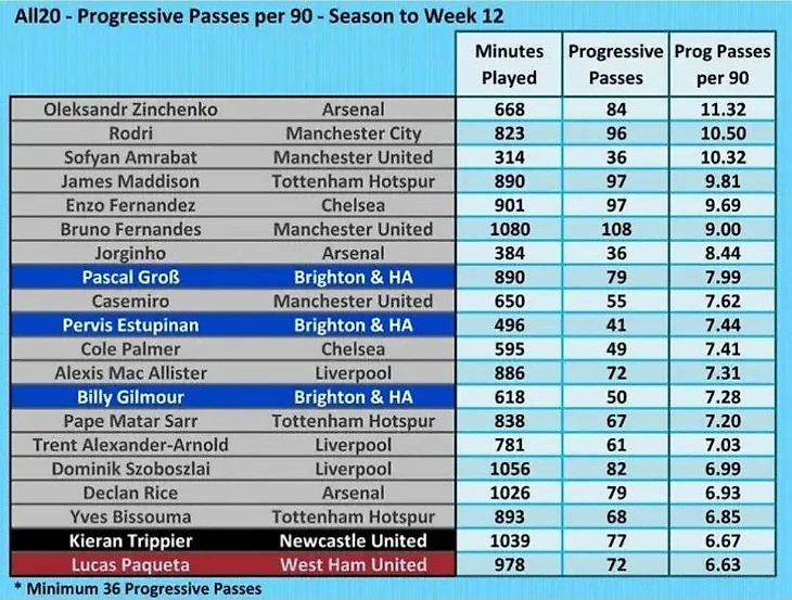 На пикче ниже – игроки с наибольшим количеством прогрессивных передач в этом сезоне АПЛ. Фернандеш отдал больше всех пасов вперёд – 108, но он и по проведенным минутам на поле лидер (1080).