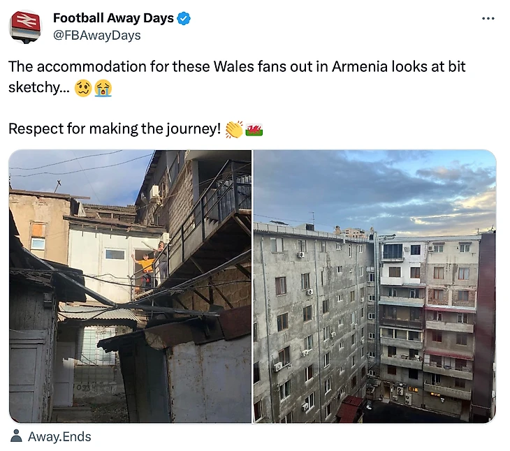 Football Away Days запостил эти фото с подводкой: «Жилье для фанатов из Уэльса выглядит немного сомнительным... Уважение за то, что отправились в эту поездку».