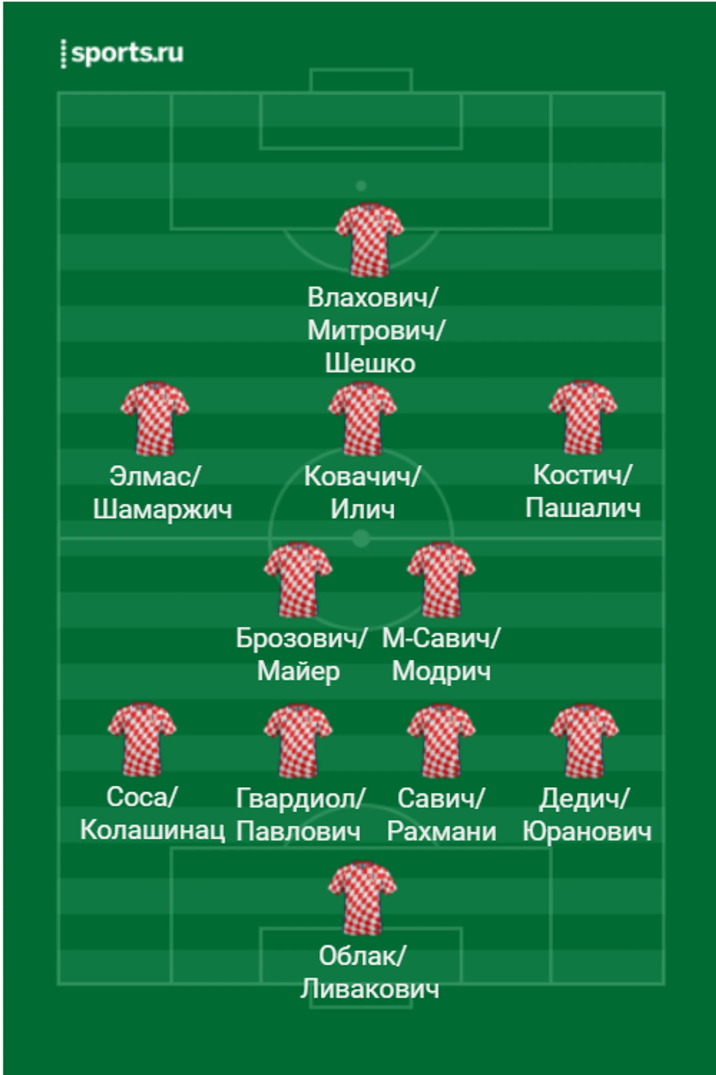 Вся сила команды будет сконцентрирована именно в линии полузащиты. Тут за долгие годы сконцентрировались как международно признанные мастера: вечномолодой и похоже бессмертный Лука Модрич и Марсело Брозович, так и неплохая подмена для них в лице Сергея Милинковича-Савича и Матео Ковачича, и менее знаменитого Ловро Майера и молодых Лазаря Шамаржича и Ивана Илича. На флангах полузащиты могут сыграть Филипп Костич, быший спартаковец Марио Пашалич и Элиф Элмас.