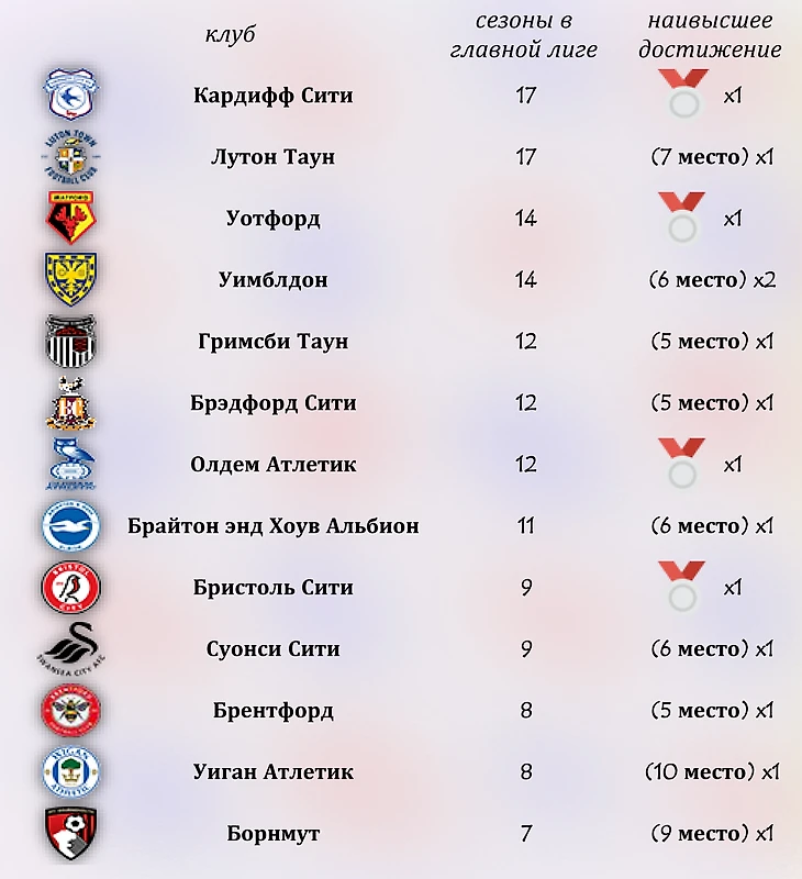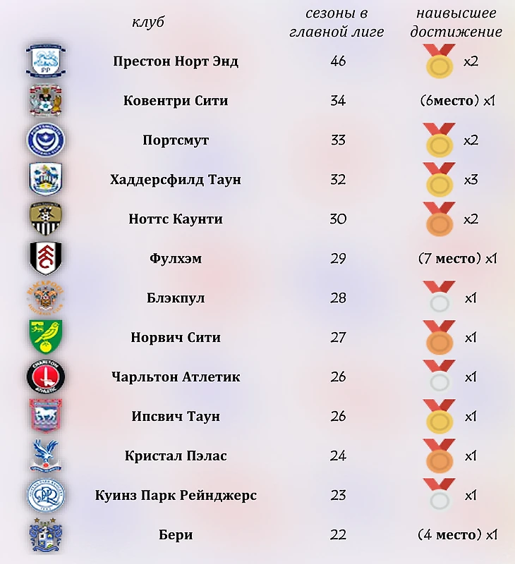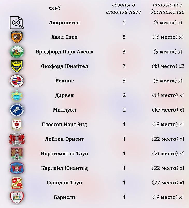Просто перечислить названия было бы как-то суховато, да и по какому критерию их сортировать тоже не вполне ясно, поэтому я решил добавить количество сезонов проведенных в высшем дивизионе в сумме (по ним и расположил, а там где количество сезонов совпадает, сначала идет тот, кто раньше дебютировал) и наивысшее достижение каждого в отдельности aka регалии. Для наглядности все в картинках ниже. Ах, еще неловкий моментик с лого клуба «Аккрингтон», что просуществовал лишь двадцать лет. Его мне найти не удалось, а лепить герб города не захотелось. Поэтому как есть.