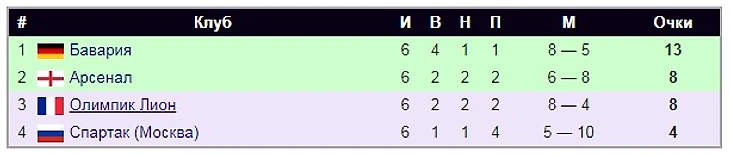 Справедливости ради отметим, что квартет «С» оказался группой смерти. Судите сами: «Арсенал» станет вторым в АПЛ (с тем «МЮ» соперничать было невозможно, но Патрика Виейра признают лучшим игроком сезона), «Лион» уже через год превратится в команду-династию, а «Бавария» вообще выиграет эту Лигу чемпионов.
