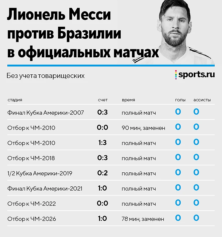 ● Месси провел 700+ минут в официальных играх против Бразилии, но у него все так же 0+0.