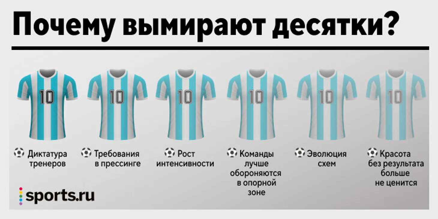 Примерно в середине 2010-х вырисовалась проблемная для десяток картина. Жертвы процесса регулярно высказывались. «Думаю, в современном футболе больше не осталось настоящих десяток. Сегодня футбол слишком тактический и очень физически требовательный. В нем нет места десяткам», – жаловался в 2017-м Хамес Родригес.