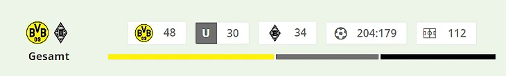 Дортмундская «Боруссия» выиграла у менхенгладбахской девять последних домашних матчей Бундеслиги при соотношении голов 32:5! Ни с одним другим клубом чемпионата команда Марко Ройса, который сыграл свои первые 97 матчей в Бундеслиге за «жеребят», в настоящее время не может похвастаться такой победной серией на домашнем стадионе.