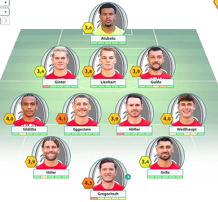 «Фрайбург» : Атуболу – Гинтер, Линхарт, Гульде – Сильдийя, Эггештайн, Хефлер, Вайсхаупт – Рель, Грифо – Хелер