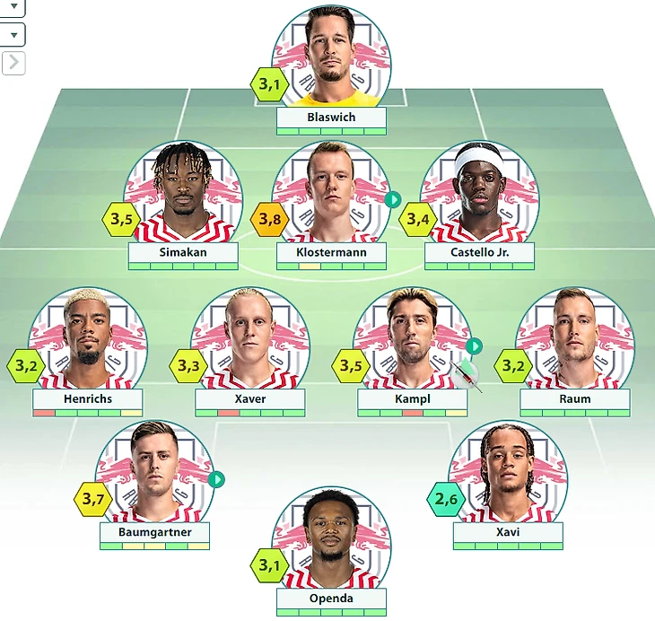 «РБ Лейпциг» : Бласвих – Хенрикс, Симакан, Кастелло, Раум – Хави, Шлагер, Кампль, Форсберг – Опенда, Шешко