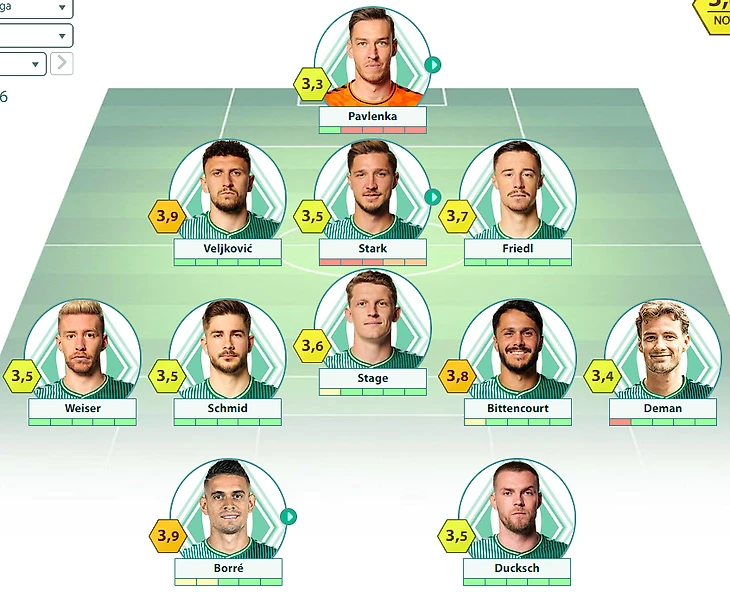 «Вердер» : Цеттерер – Велькович, Фридль, Юнг – Вайзер, Шмид, Стаге, Битенкур, Деман – Борре, Дукш