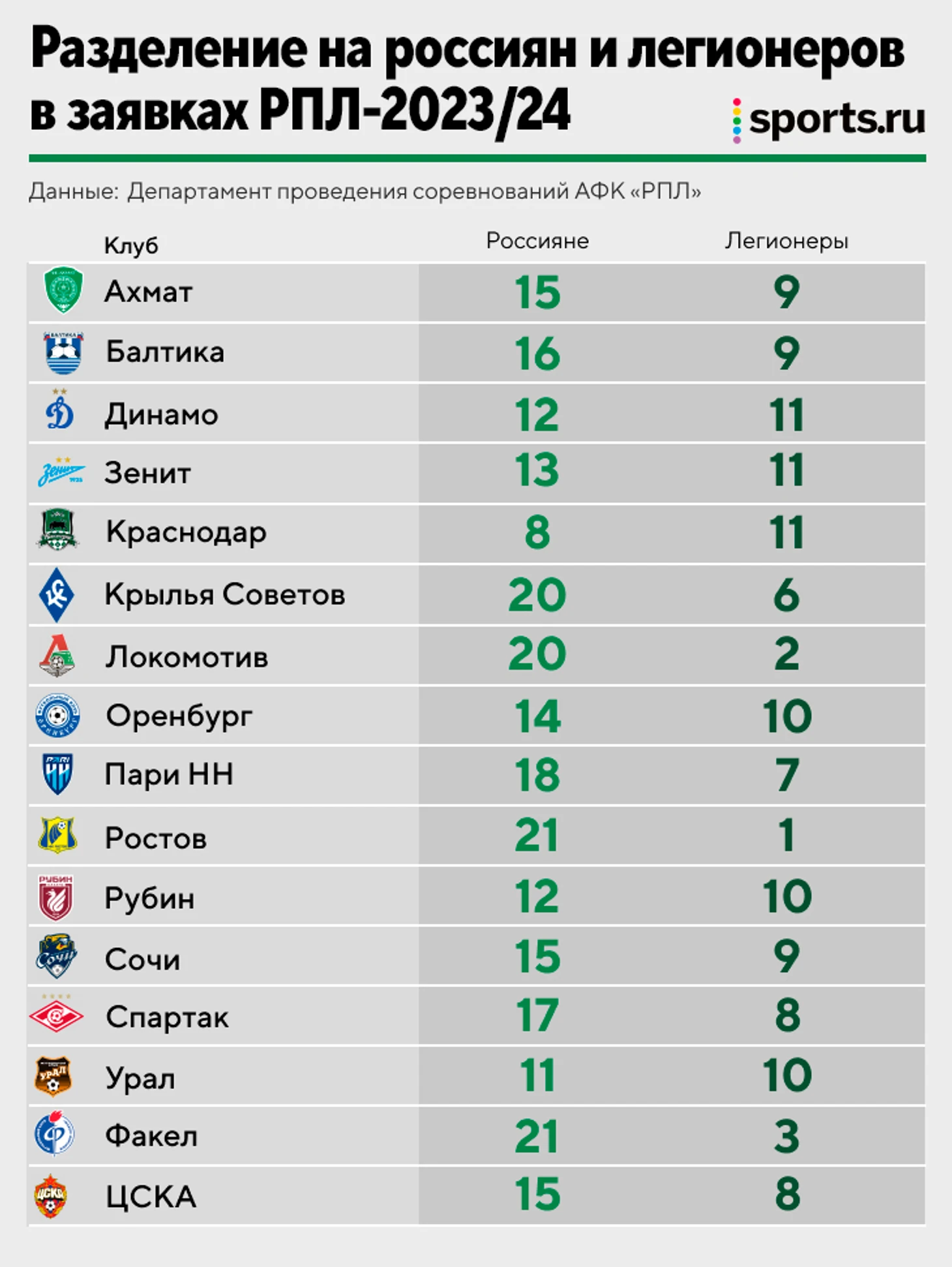 «Зенит», «Краснодар» и «Балтика» – лидеры по заявленным легионерам (11). «Ростов» (1), «Локо» (2) и «Факел» (3) – противоположности.
