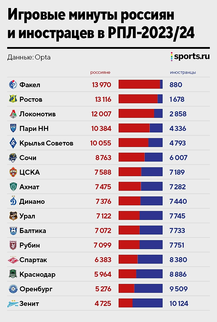 Лишь «Ростов», «Факел» и «Локомотив» не зависят от иностранцев, остальные задействуют их активнее. В некоторых клубах легионеры усиливают состав точечно (например, «Пари НН» и «Крылья»), но в большинстве – массово на ведущих ролях.