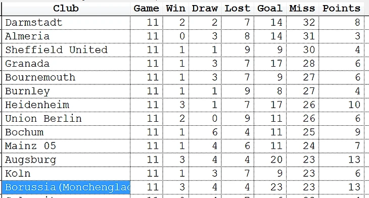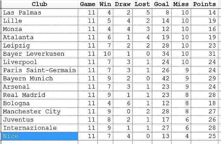 Сравним очки, победы, поражения, ничьи, забитые и пропущенные.