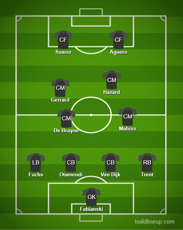 Вот как выглядит эта команда: Лукаш Фабианьски, Трент Александр-Арнольд, Вирджил ван Дейк, Николас Отаменди, Кристиан Фукс, Рияд Марез, Стивен Джеррард, Кевин де Брюйне, Эден Азар, Серхио Агуэро, Луис Суарес.