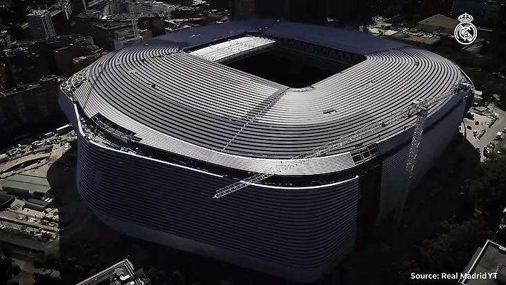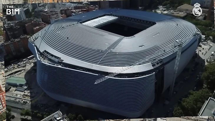 Это новый «Сантьяго Бернабеу». Стадион Реал Мадрида - одного из крупнейших футбольных клубов мира. Недавно, он подвергся реконструкции стоимостью 1 миллиард долларов. Теперь он как-бы завернут в сталь и имеет масштабную подсветку - для показа движущихся изображений.