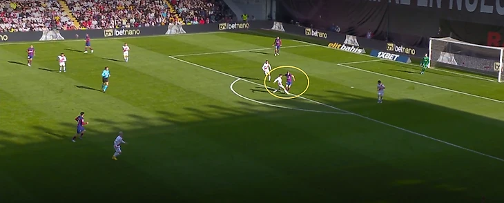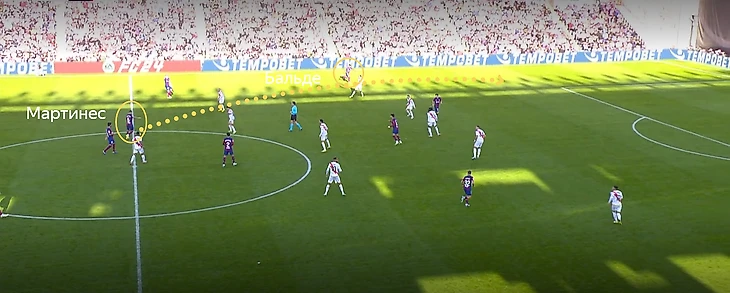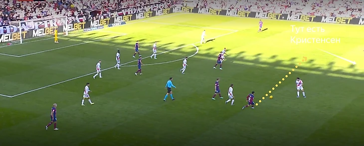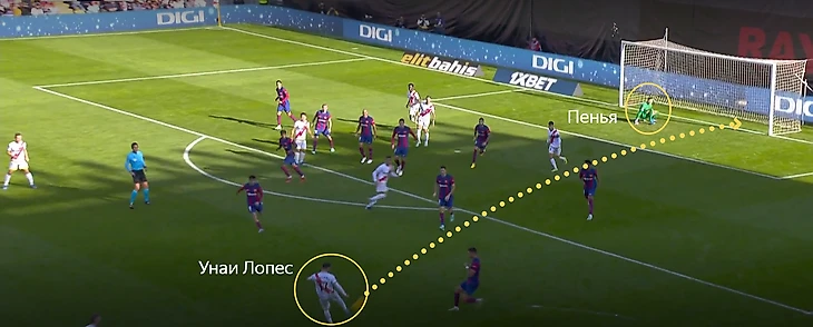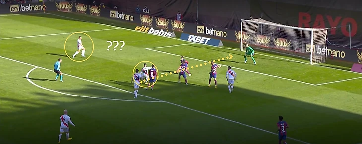 Здесь решение Хави может казаться логичным, но Ромеу плохо смотрелся и на другой позиции, а Френки часто не хватало выше. Плюс Де Йонга тоже регулярно накрывали давлением. Здесь «Райо» отобрал мяч перед чужой штрафной и имел создал шанс.