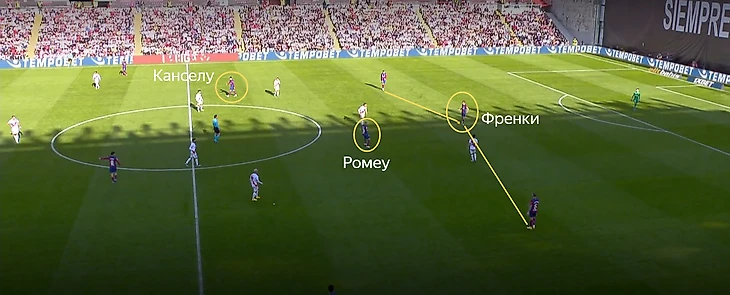 Большие вопросы по составу вызывал центр поля. Вернулся Френки, рядом появились Ромеу и Педри. При этом расположение игроков удивило. В начальной стадии атаки не Ромеу, а Де Йонг опускался в тройку защитников для лучшего продвижения.