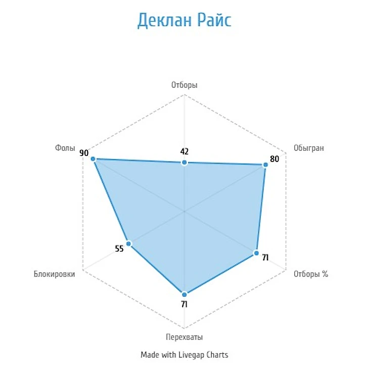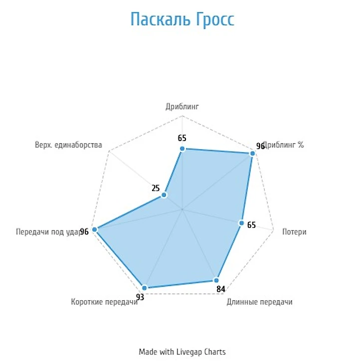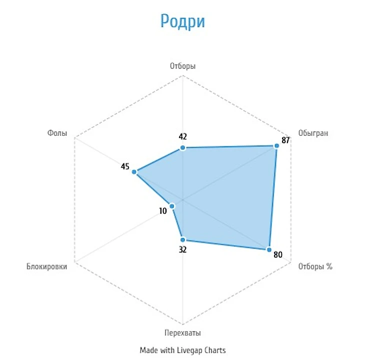 Принцип диаграммы тот же, если у Родри дриблинг стоит на отметке 84, то это означать, что он лучше 84% игроков по этому показателю.