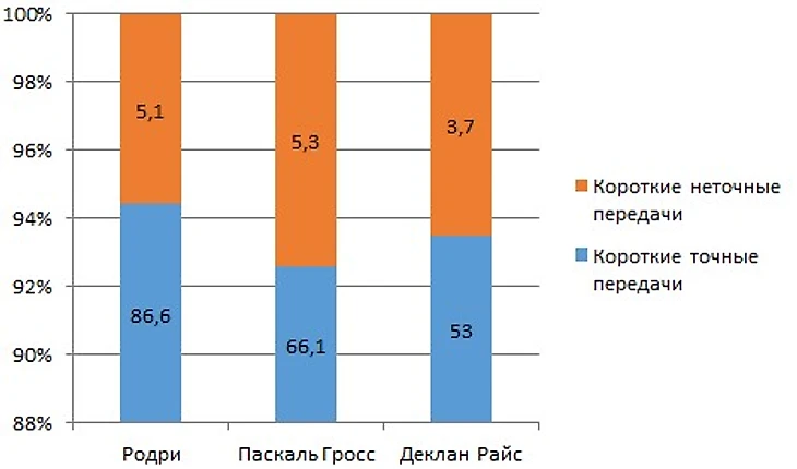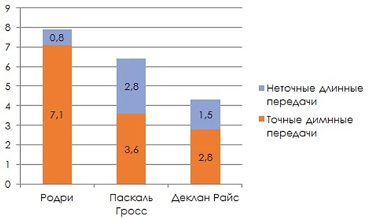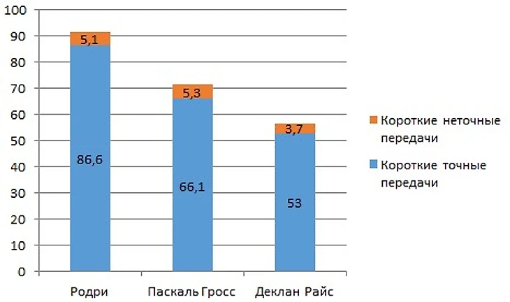 Здесь опять Родри является первым в лиге по общему количеству сделанных коротких пасов.