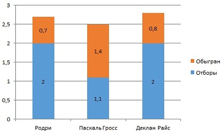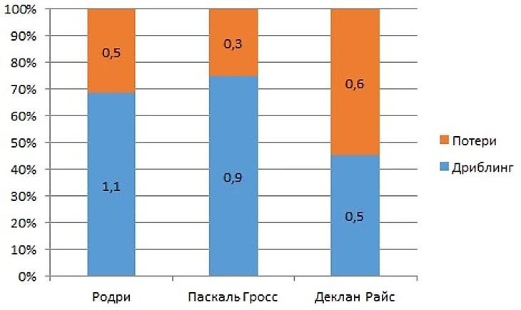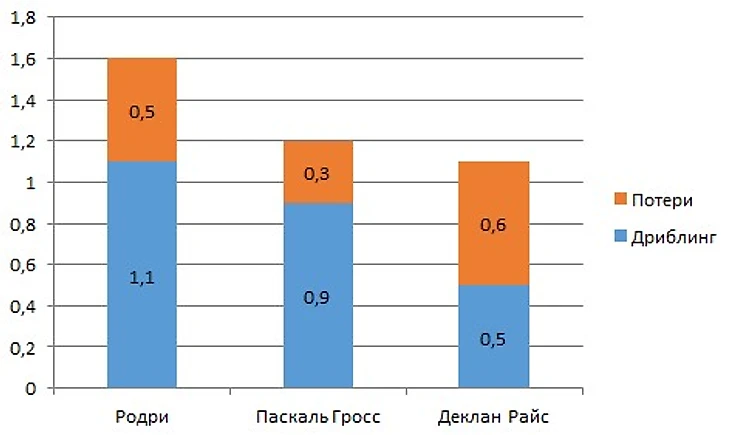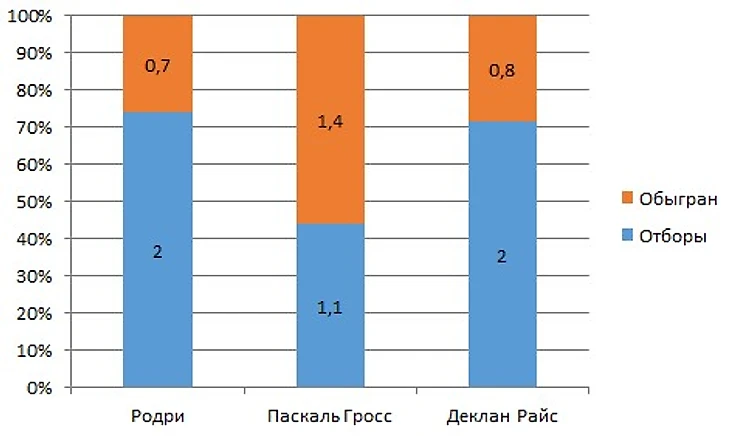 У Родри можем наблюдать за предельный уровень. Он первый в лиге как по количеству, так и по процент.