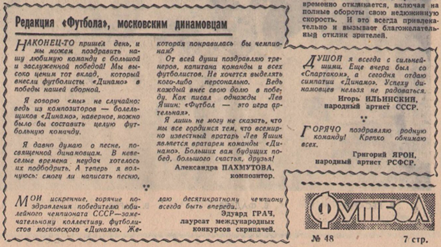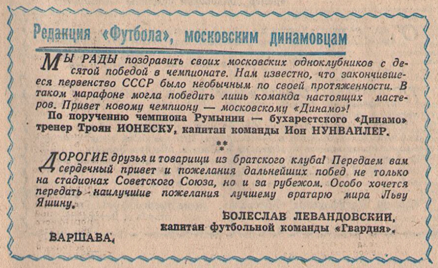 На страницах еженедельника «Футбол» были опубликованы поздравительные телеграммы со всех концов планеты.