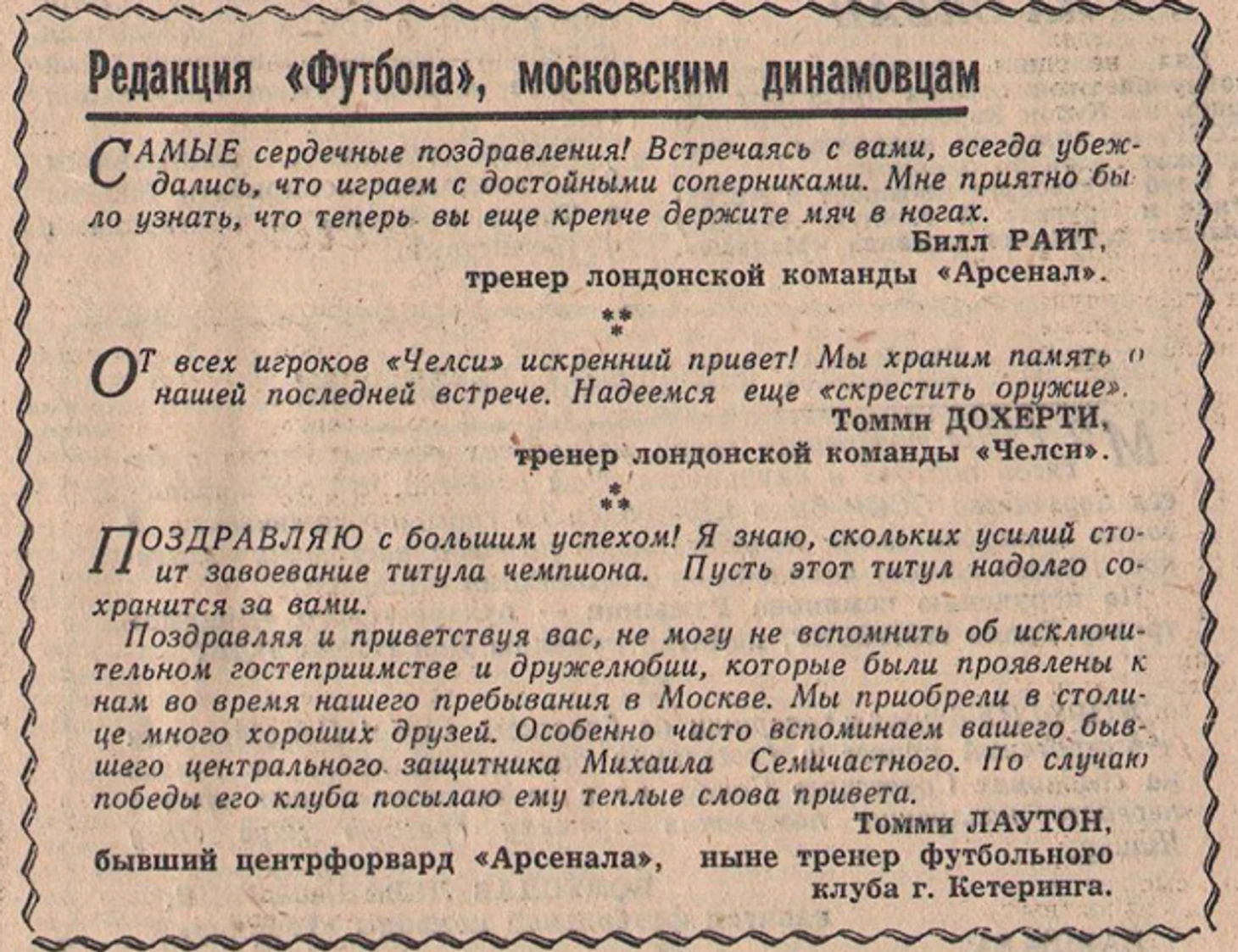 Поздравили динамовцев даже именитые футболисты и тренеры англичане Билли Райт, Томми Дохерти и участник матча «Челси» - Динамо» 1945 года Томми Лаутон, румыны Троян Ионеску и Ион Нунвайлер и польский футболист Болеслав Левандовски.