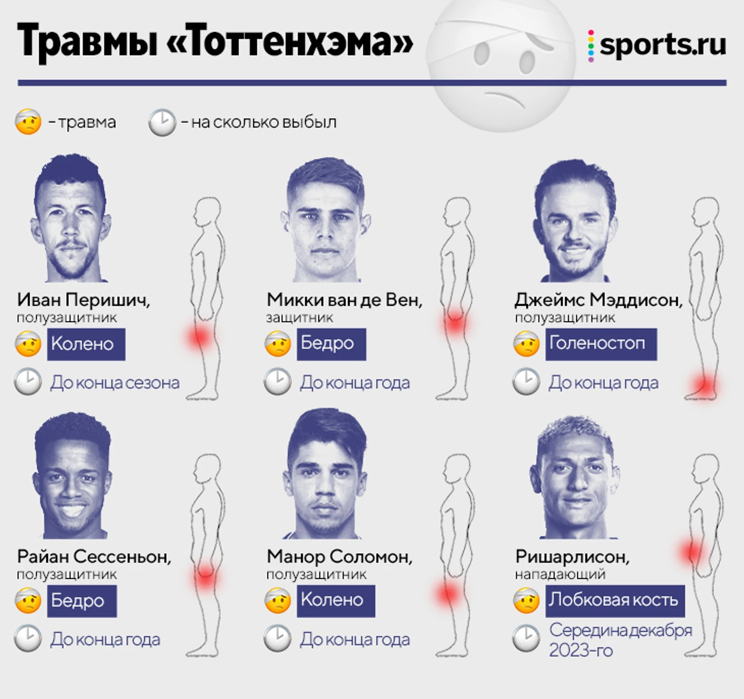 ● Главная причина неудач – эпидемия травм: семеро травмированных (особенно тяжело без главной звезды старта сезона – Джеймса Мэддисона), двое дисквалифицированных (Кристиан Ромеро и Ив Биссума).