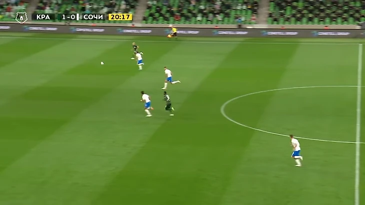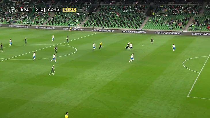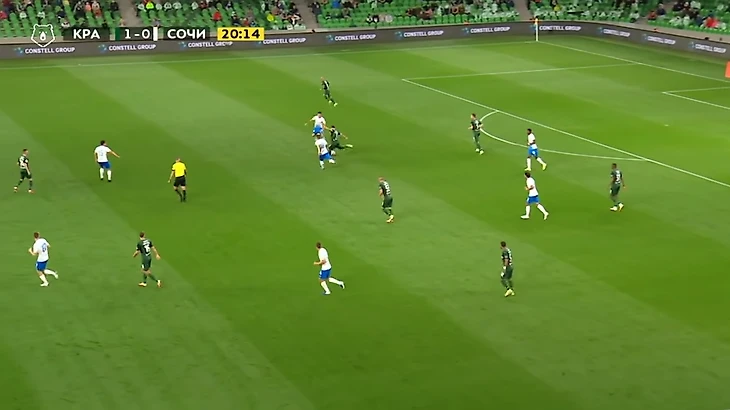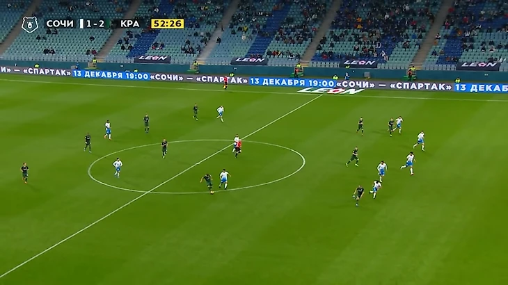 После потери Сочи мяч от защитника Краснодара получает опорник Крыховяк в центральной зоне. Следует передача в полуфланг инсайду.