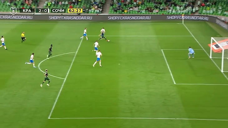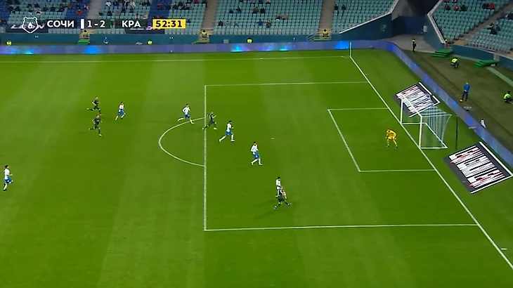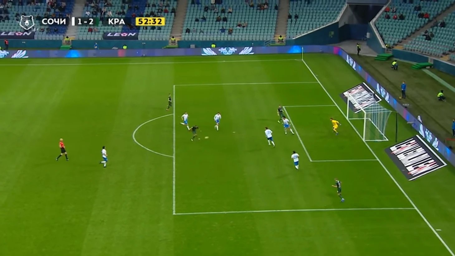 Почти все комментаторы после игры ЦСКА -Динамо отмечали разные таймы в матче. В 1-ом - лучше играл ЦСКА, во 2-ом - Динамо. А мне сама игра крайне напомнила игры Сочи с Краснодаром сезона 2021/22, когда Федотов со своей схемой 3-4-3 был просто разнесен «в клочья» в «красочном дерби» соперником, игравшим 4-2-3-1. Приведу скриншоты голевых атак Краснодара в их развитии.