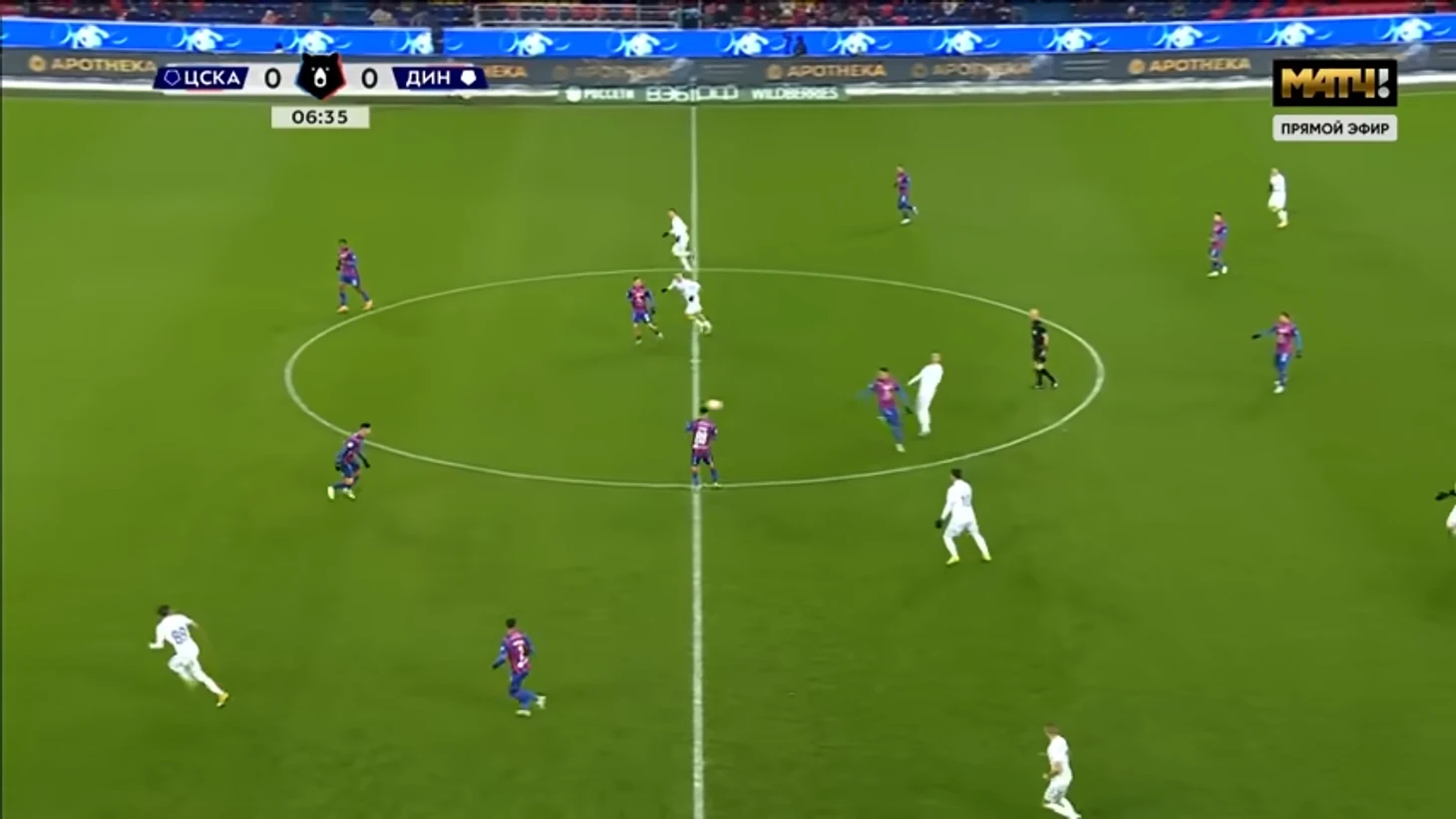 Посмотрим теперь на голы Динамо в разбираемом «братском дерби». При 1-ом голе пас из «опорки» в полуфланг за спину Зделару делает Фомин, отрезая латераля Келлвена.