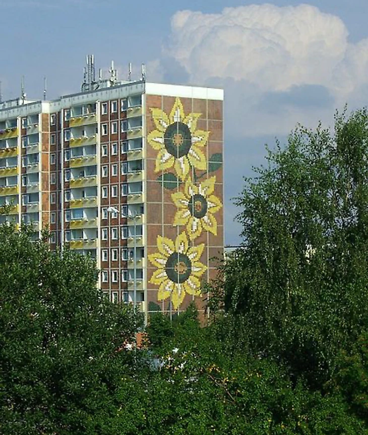 Казалось бы, на полотне нарисован обычный панельный дом – вполне типичное строение для стран тогдашнего социалистического лагеря, к коим относилась и ГДР, на территории которой располагался и город Росток. Даже подпись «Plattenbau Rostock» ни о чём не говорит, ведь словом «plattenbau» там называют обычные панельные высотки. Но для понимания контекста стоит внимательнее присмотреться к правой части баннера, на которой изображён фасад одного из домов с нарисованными на нём подсолнухами.