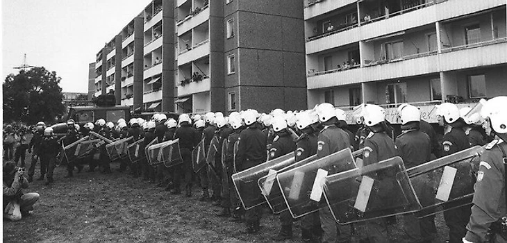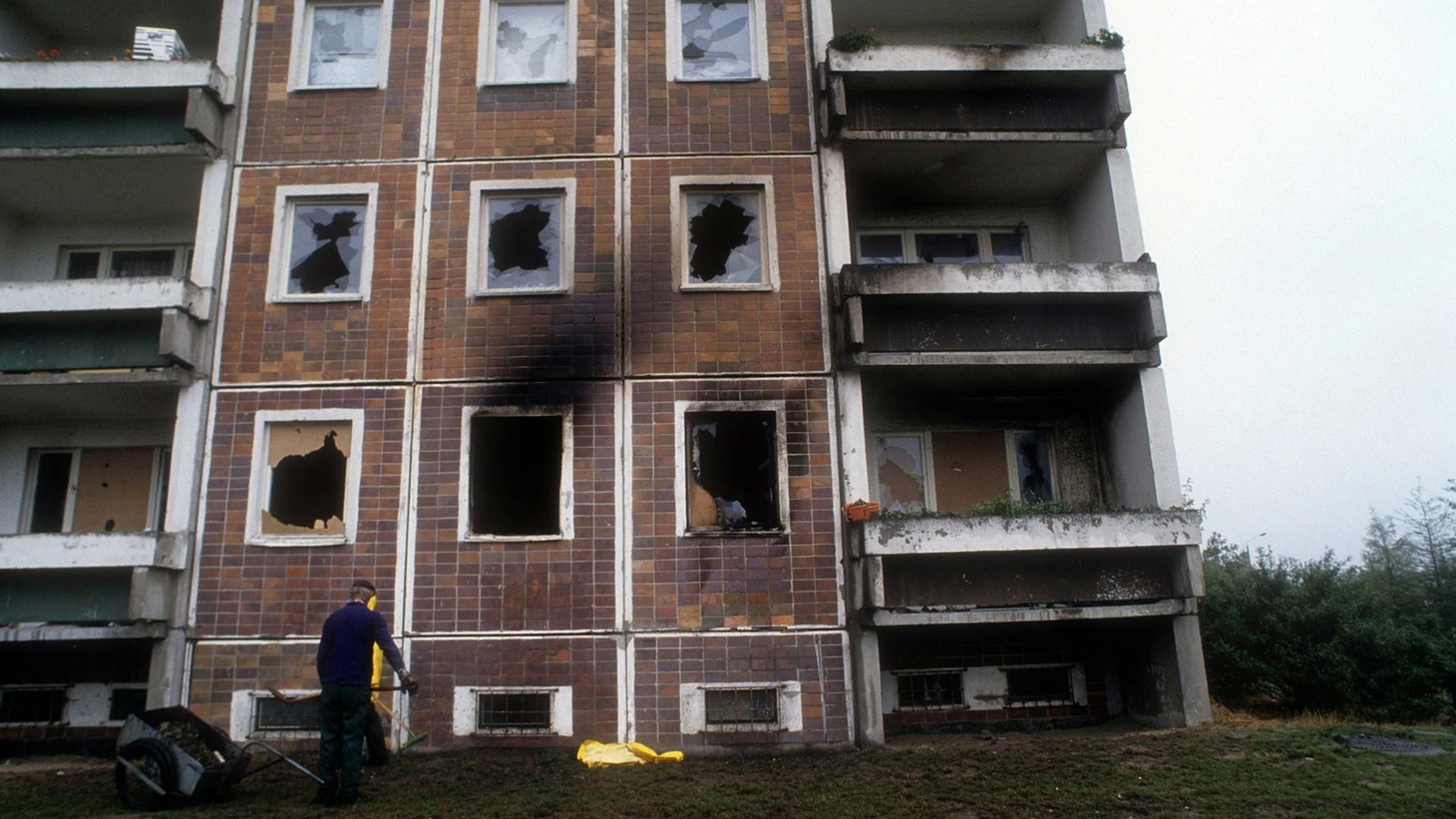 Так называемый «дом с подсолнухами» – абсолютно реальный и расположен в ростокском районе Лихтенхаген. Более 30 лет назад, а именно летом 1992 года, этот 11-этажный дом печально прославился на всю страну, когда несколько сотен правых радикалов из Ростока (вместе с хулиганами «Ганзы»), а также близлежащих городов, атаковали этот дом. Всё дело в том, что в одном из подъездов этого дома было общежитие для вьетнамцев, работавших по контракту в ГДР. В другом – регистрационный пункт для иностранцев, добивавшихся политического убежища в Германии. Здесь фиксировались их обращения и на время рассмотрения их распределяли по другим общежитиям области Мекленбург-Передняя Померания, к которой относился и крупнейший город Росток. Но бюрократия оказалась непобедимой проблемой даже для казалось бы цивилизованной Германии – из-за большого потока беженцев очереди в этот регистрационный пункт становились всё больше и больше, а людям, дабы не терять своё место в этой очереди, приходилось жить прямо перед домом. Из числа всех приехавших в Германию в поисках лучшей жизни только 300 людям в месяц полагалось временное заселение в «дом с подсолнухами» – остальных должны были перераспределить по аналогичным общагам в других городах региона. Но рассмотрение каждого обращения затягивалось, что привело к полнейшей катастрофе: в августе того года вместо 300 людей в этом доме (и в его дворе) жило больше 11 тысяч человек!
