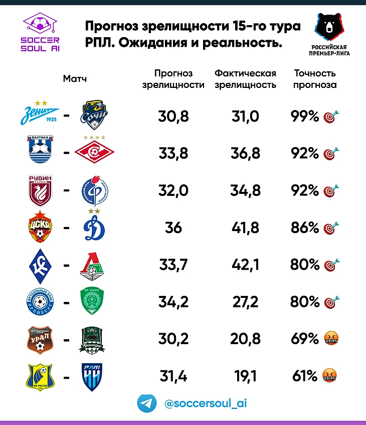 🎯 Еще четыре игры превзошли изначальные прогнозы, а матчи ЦСКА-Динамо и Крылья Советов-Локомотив порадовали болельщиков высоким показателем зрелищности, ушедшим за 40 баллов!