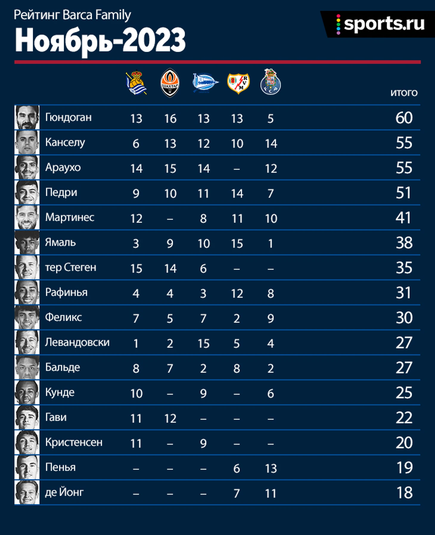 За первое место игрок получается количество баллов равное последнему месту. И наоборот, игрок с последнего места получает только 1 балл, с предпоследнего — 2 и т.д. В конце каждого месяца мы суммируем эти баллы и формируем общий рейтинг. При такой модели очень хорошо виден вклад каждого футболиста на дистанции. Важно не просто сыграть хорошо один матч, а быть полезным на протяжении всего месяца: регулярно выходить на поле и приносить результат. В ноябре «Барселона» провела 5 матчей, но результат не самый хороший: 3 победы, 1 ничья и 1 поражение. Команда выполнила задачу с выходом в плей-офф лиги чемпионов, но теряет позиции в Ла Лиге.