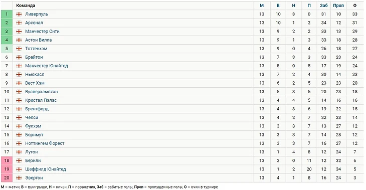 Рассмотрим турнирную таблицу после 13-го тура АПЛ: