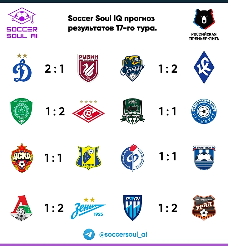 или прогноз матчей 17-го тура РПЛ ⚽.