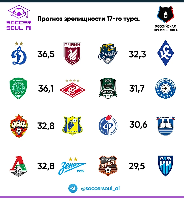 ❗️❗️❗️Пришла зима, пришёл футбол.🔜 Прогноз зрелищности результатов 17-го тура РПЛ от нейросети