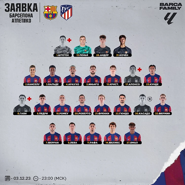 В заявку не попали: Марк-Андре тер Стеген – все еще проблемы со спиной. Гави – выбыл до конца сезона. Маркос Алонсо – на вчерашней тренировке испытывал дискомфорт, поэтому было принято решение не рисковать и предоставить футболисту отдых для восстановления. Марк Касадо – задействован за «Барселону Атлетик»