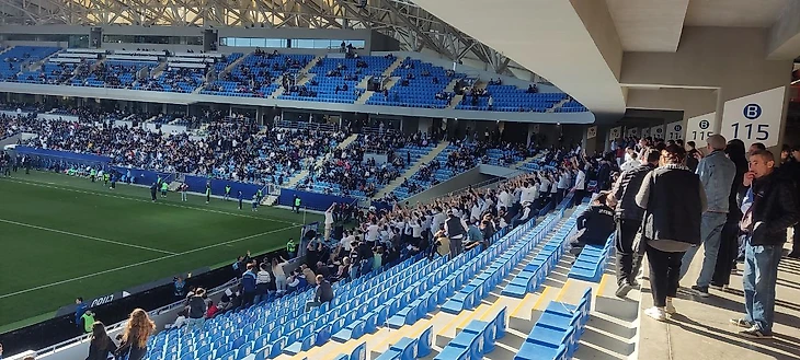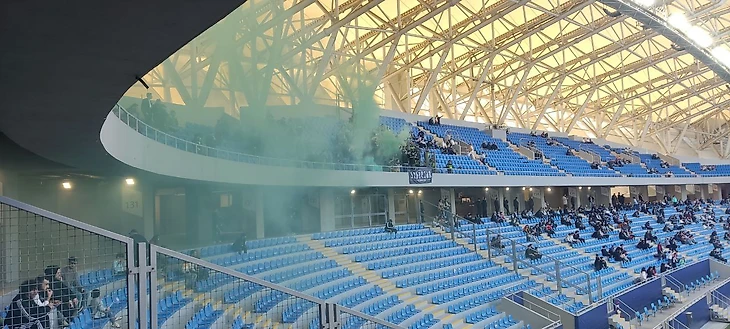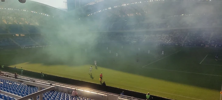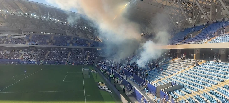 Только к этому моменты на выездной сектор были запущены гости из Кутаиси. Вошли, надо сказать, эффектно: несколько взрывов петард, файеры с зеленым дымом (один из цветов Торпедо, обычно для выездной формы). По стечению обстоятельств в это же время, буквально через пару минут после второго гола Динамо, торпедовцы получили право на пенальти, который конвертировали в гол, пусть и с добивания. В общем, у болельщиков из Кутаиси получилось увидеть гол своей команды, так сказать, на первой минуте матча))).