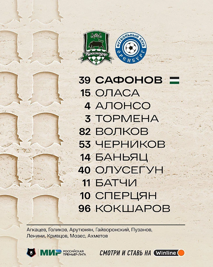 У «Краснодара» Кокшаров вместо Кордобы и неожиданно Баньяц вместо Кривцова. Эктова нет даже в запасе.