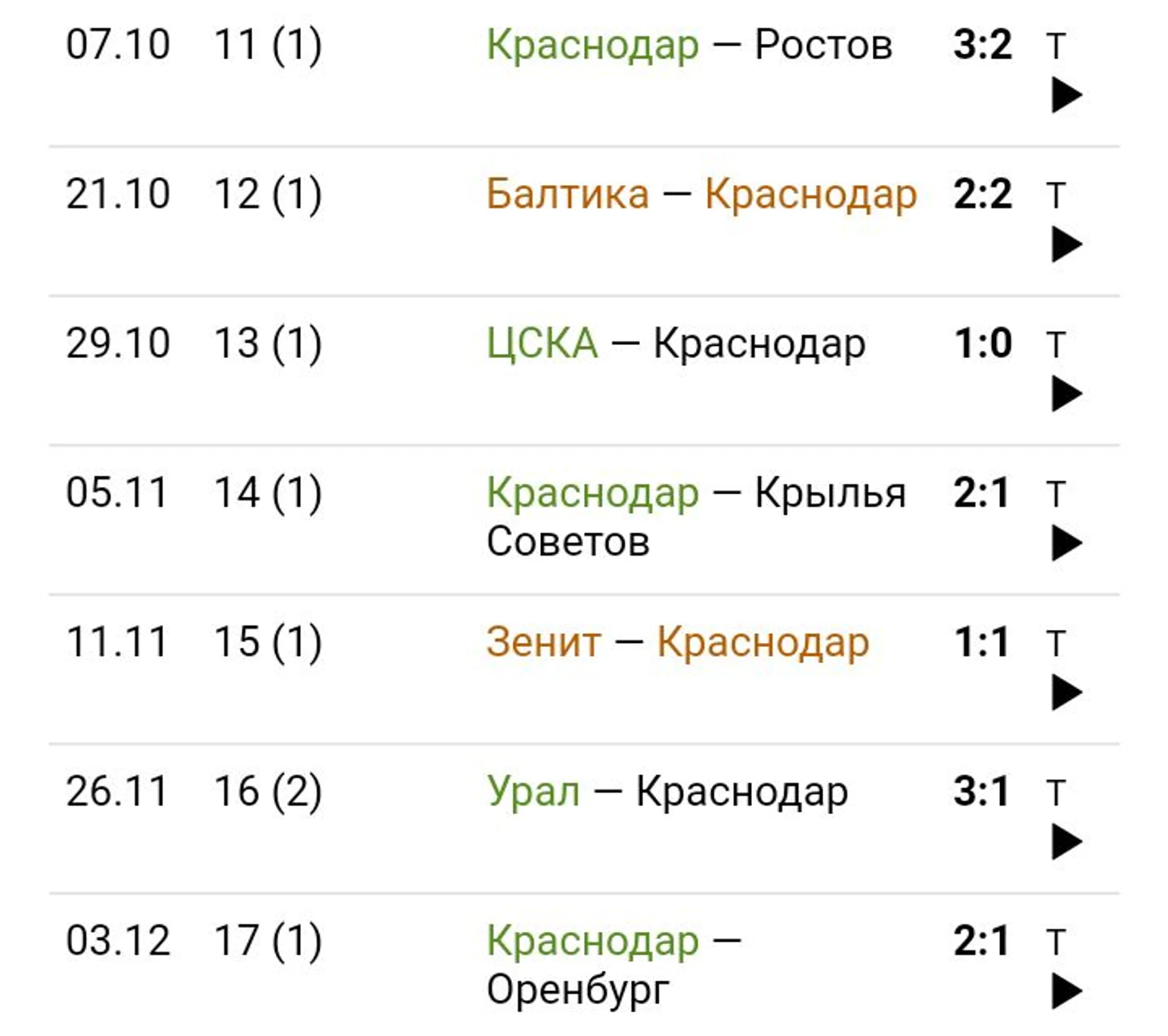 На скрине последние матчи «Краснодара» в РПЛ. Мало того, что команда потеряла кучу очков, так еще и выигрывала максимум в один мяч. Так же плохо как «Оренбург» на этом фоне выглядели только «Крылья». И это еще повезло, что у «Краснодара» не было Кордобы и левых защитников.