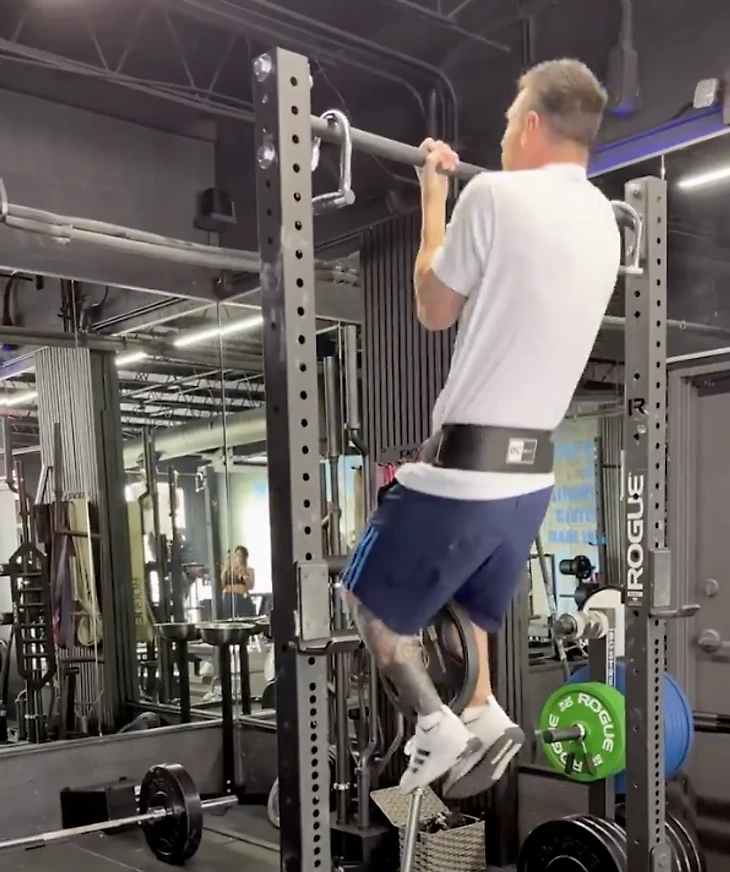 На этом фото, например, Лео делает подтягивания с отягощением (хват не осуждаем).