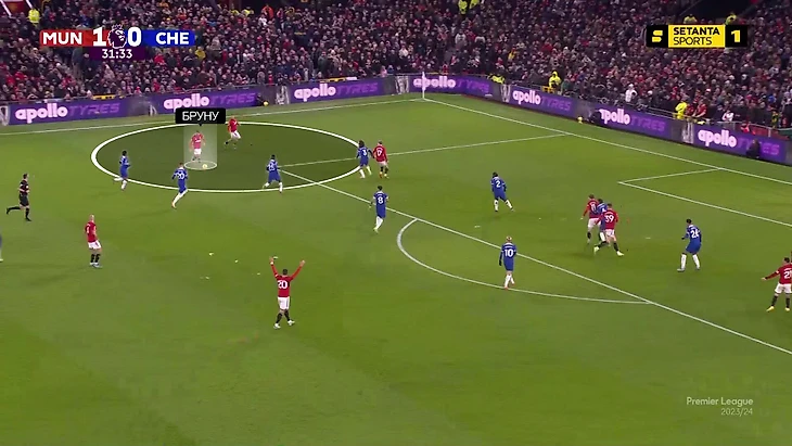 Удивительно, но иногда Бруну не накрывали, даже когда у «Челси» было заведомо больше футболистов (включая отрабатывающего Стерлинга и подтянувшегося к флангу Кайседо):