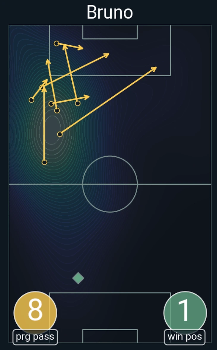Опаснее всего выглядели отходы Бруну в эту зону. Очень показательна карта продвигающих пасов португальца – он организовал больше всех в матче (8). Зона креативности четко слева.