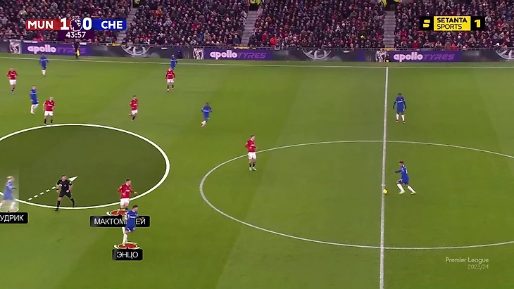 Как следствие, позициями полузащитников было проще манипулировать. Часто теряли игроков, которые не стартуют в этой зоне, а приходят туда. Этот фактор сыграл в голе «Челси». Энцо уводит Мактоминея и открывают линию паса на сместившегося с фланга Мудрика – из-за ориентировок он свободен: