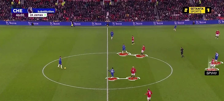 На правом фланге у «Челси» по тайму отыграли Кукурелья и Рис Джеймс. Зона была проблемной – Шоу отлично продвигал мяч (и как левый защитник, и как центрдеф), Гарначо опасен 1-в-1, для перегрузов смещался Бруну. Контролировать сразу все источники угрозы не получалось.